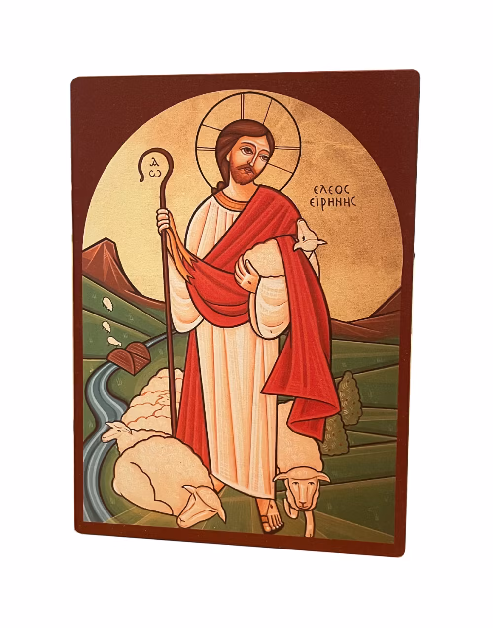Kristus – den gode herden, så bär på ett lamm och för sina får till gröna ängar och lugna vatten. Denna ikon i koptisk tradition. Den tryckta versionen kommer i rektangulär form med röd färg uppe i hörnen.